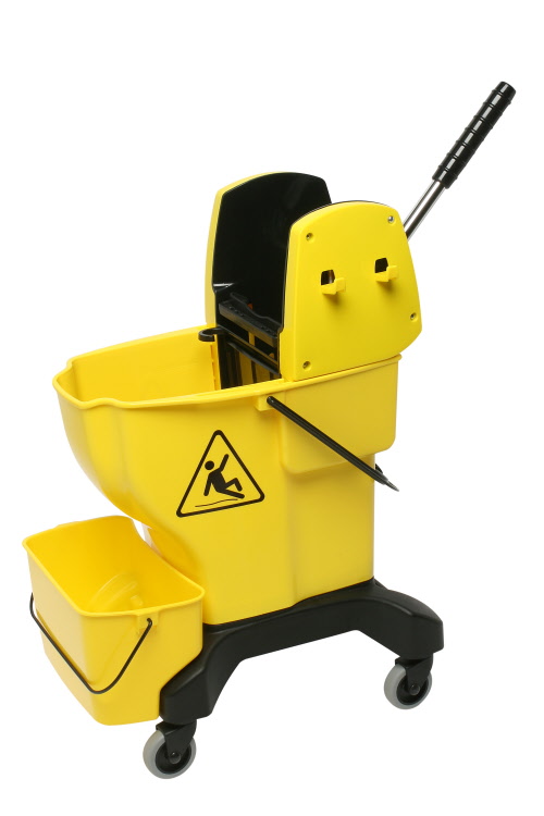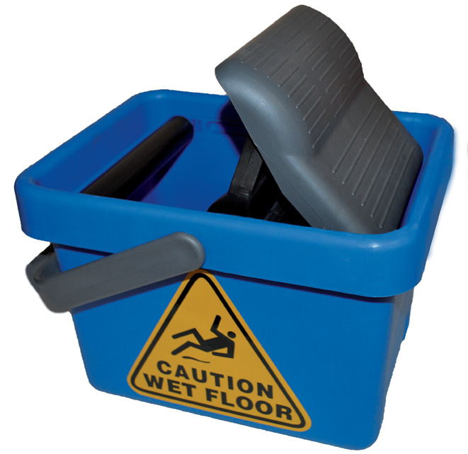 16 Litre wringer bucket with non-marking white wheels. Durable, thick metal action